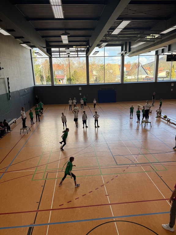 Am 04.11.2025 fanden die diesjährigen Kreisjugendspiele des Unstrut-Hainich-Kreises im Zweifelderball statt. Insgesamt traten 21 Schulen in der Salza-Halle in Bad Langensalza gegeneinander an, sodass 69 beeindruckende Spiele ausgetragen wurden. Unterstützt wurden diese von sechs Handballerinnen des THC Bad Langensalza, die als Schiedsrichterinnen fungierten und für einen reibungslosen Ablauf sorgten. Aus unserer Schule nahmen 13 Schüler und Schülerinnen aus der 4. Jahrgangsstufe teil
